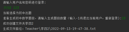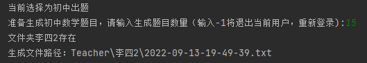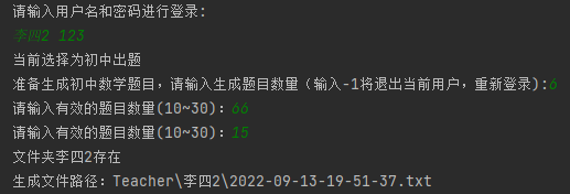 如果输入题目量正确则会自动创建教师单独的文件夹并提示创建成功,还会给出文件路径 如果文件夹已存在则会提示该文件夹已存在