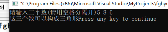 #include <stdio.h> main() { int a,b,c,n1,n2,n3; printf("请输入三个数(请用空格分隔开)"); scanf("%d %d %d",&a,&b,&c); n1=a+b; n2=a+c; n3=b+c; if (n1>c&&n2>b&&n3>a) printf("这三个数可以构成三角形"); else printf("这三个数不能构成三角形"); }