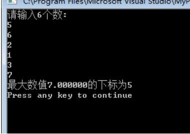 #include<stdio.h> main() { double n[6],max; int i,flag; printf("请输入6个数:\n"); for(i=0;i<=5;i++) scanf("%lf",&n[i]); max=n[0]; flag=0; for(i=1;i<=5;i++) if(n[i]>max) { max=n[i]; flag=i; } printf("最大数值%f的下标为%d\n",max,flag); }