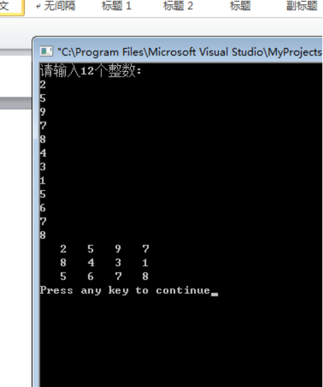 #include<stdio.h> main() { int s[3][4]; int i,j; printf("请输入12个整数:\n"); for(i=0;i<=2;i++) for(j=0;j<=3;j++) scanf("%d",&s[i][j]); for(i=0;i<=2;i++) { for(j=0;j<=3;j++) printf("%4d",s[i][j]); printf("\n"); } }