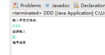 package aaa; import java.util.Scanner; public class DDD { public static void main(String[] args) { // TODO Auto-generated method stub Scanner input=new Scanner(System.in); System.out.println("输入学生的姓名:"); while(true) { String name=input.next(); if("Q".equals(name)) { System.out.println("程序结束"); break; }else { System.out.println("继续输入"); continue; } } } }![]()