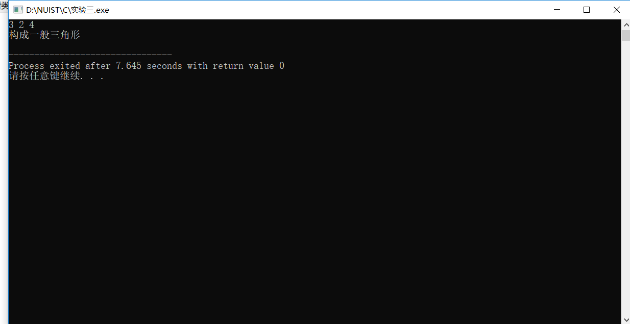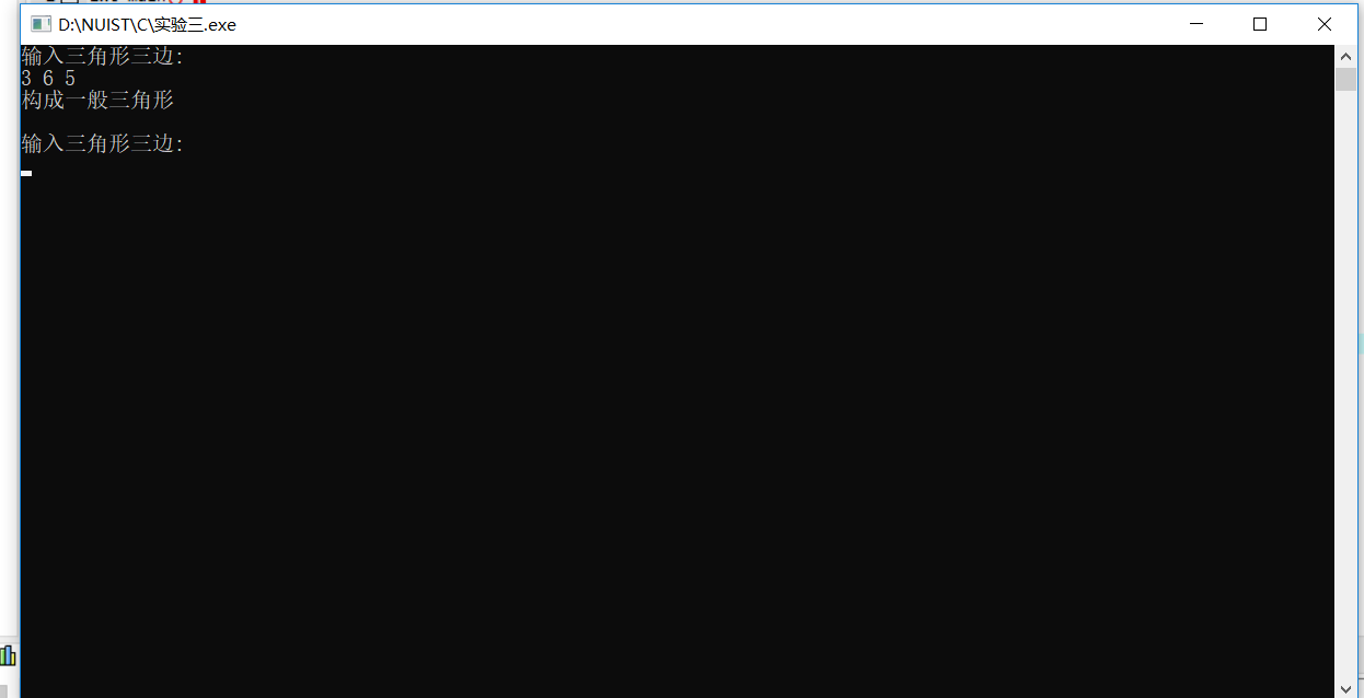 #include <stdio.h> int main() { double a,b,c; printf("输入三角形三边:\n"); while(scanf("%lf%lf%lf",&a,&b,&c)) { if(a+b>c && a+c>b && b+c>a) { if(a==b && a==c) printf("构成等边三角形\n"); else if(a==b || a==c || b==c) printf("构成等腰三角形\n"); else printf("构成一般三角形\n"); } else printf("不能构成三角形\n"); printf("\n输入三角形三边:\n"); } return 0; }