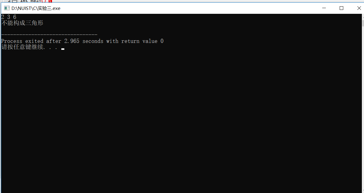 #include <stdio.h> int main() { double a,b,c; scanf("%lf %lf %lf", &a, &b, &c); if(a+b>c && a+c>b && b+c>a) { if(a==b && a==c) printf("构成等边三角形\n"); else if(a==b || a==c || b==c) printf("构成等腰三角形\n"); else printf("构成一般三角形\n"); } else printf("不能构成三角形\n"); return 0; }