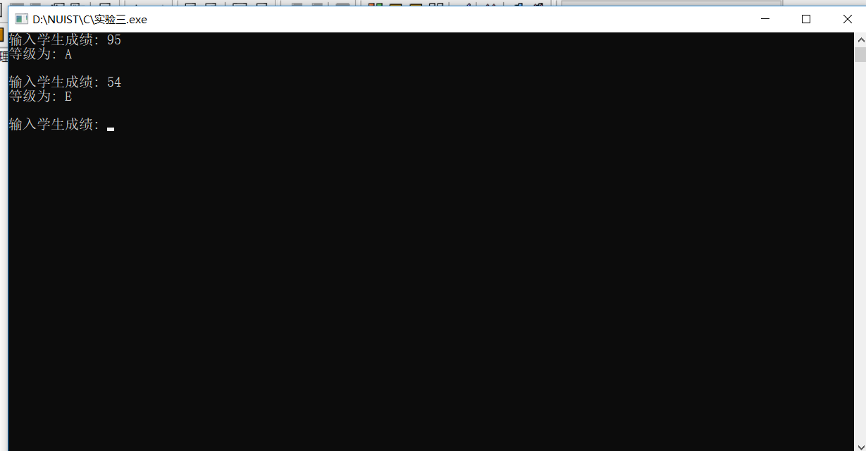 #include <stdio.h> int main() { int score; // 用于存放百分制分数 char grade; // 用于存放等级制分数(取值'A', 'B','C','D', 'E') while(1) { printf("输入学生成绩: "); if(scanf("%d",&score) == 0) // 如果检测到没有成绩输入,则结束整个循环 break; if(score<0 || score > 100) { printf("输入成绩有误!\n\n"); continue; // 结束本次循环,开始下一次循环 } else if(score>=90 && score<=100) grade = 'A'; else if(score>=80 && score<=89) grade = 'B'; else if(score>=70 && score<=79) grade = 'C'; else if(score>=60 && score <=69) grade = 'D'; else grade = 'E'; printf("等级为: %c\n\n", grade); } return 0; }