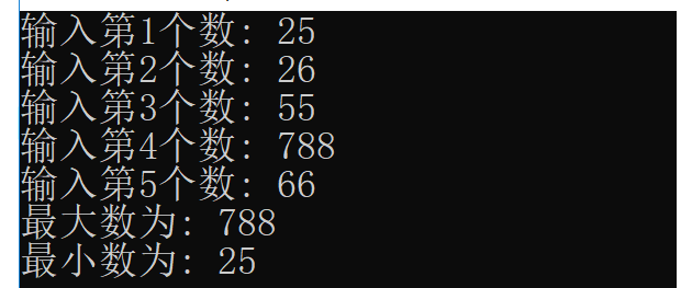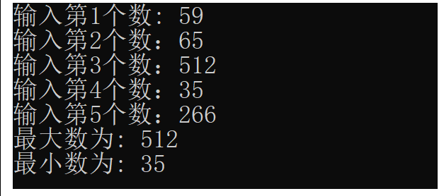 #include <stdio.h> int main() { int number, max, min, n; n=1; printf("输入第%d个数: ", n); scanf("%d", &number); max = number; min = number; for(n=2;n<=5;n=++n) { printf("输入第%d个数:",n); scanf("%d", &number); if(number>max) max = number; else if(number<min) min = number; } printf("最大数为: %d\n", max); printf("最小数为: %d\n", min); return 0; }