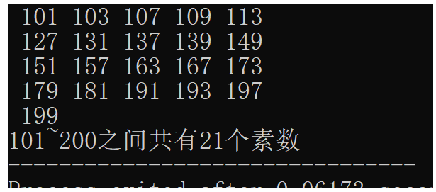 //输出101~200之间的素数 #include <stdio.h> #include <math.h> int main() { int x,n,nub,col; n=2;x=101;nub=0;col=0; while(x<=200){ while(x%n!=0) { if(n<=sqrt(x)) n=++n; else{ printf("%4d",x); nub=++nub;col=++col; break; } } if(col==5){ printf("\n"); col=0; } x=++x; n=2; } printf("\n101~200之间共有%d个素数",nub); return 0; }