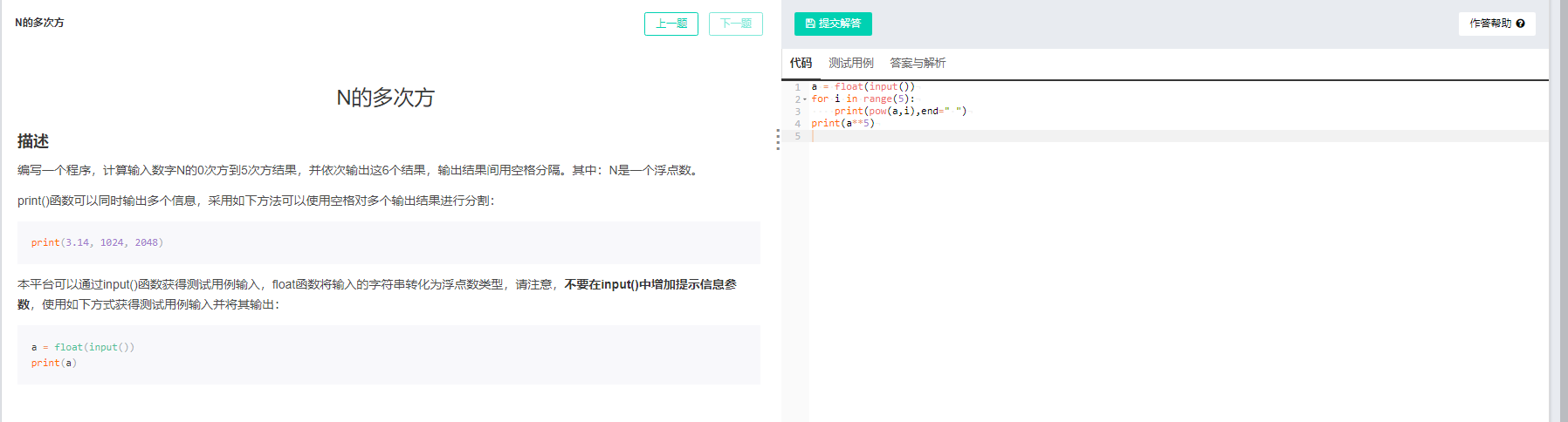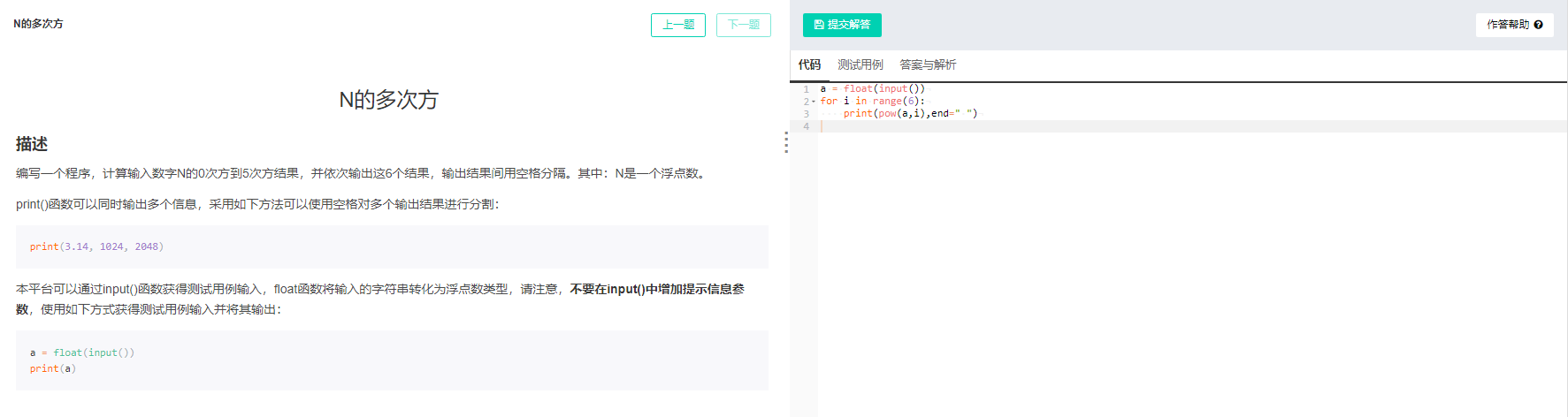 分析:题目要求“计算输入数字N的0次方到5次方结果”,即从N的0次方开始循环到N的5次方,for i in range()中应该填入数字6,但是输出结果显示错误,错误原因是:最后一个输出结果也存在了空格。更改方法是:先输出N的0次方到4次方结果再输出N的6次方,以避免出现多余的空格。