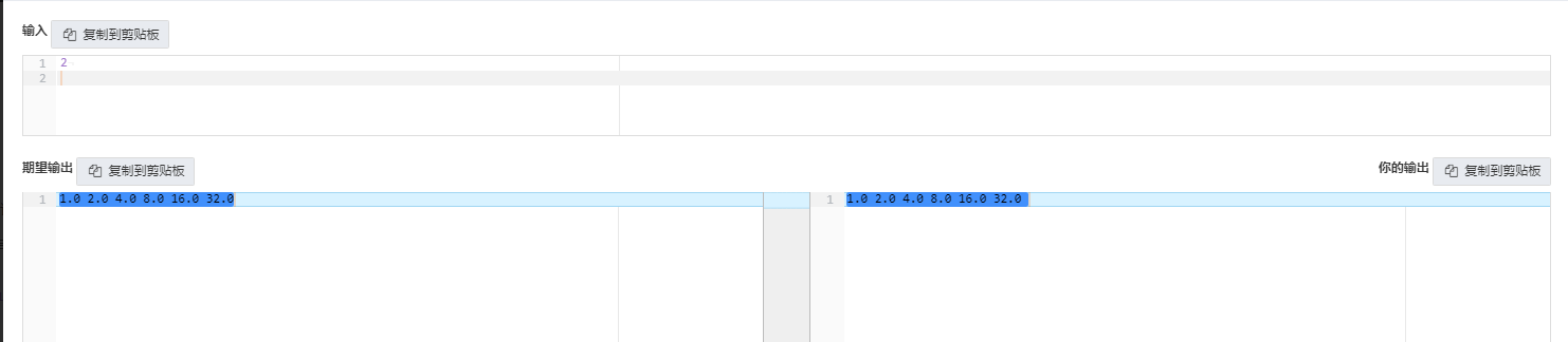 编写一个程序,计算输入数字N的0次方到5次方结果,并依次输出这6个结果,输出结果间用空格分隔。其中:N是一个浮点数。