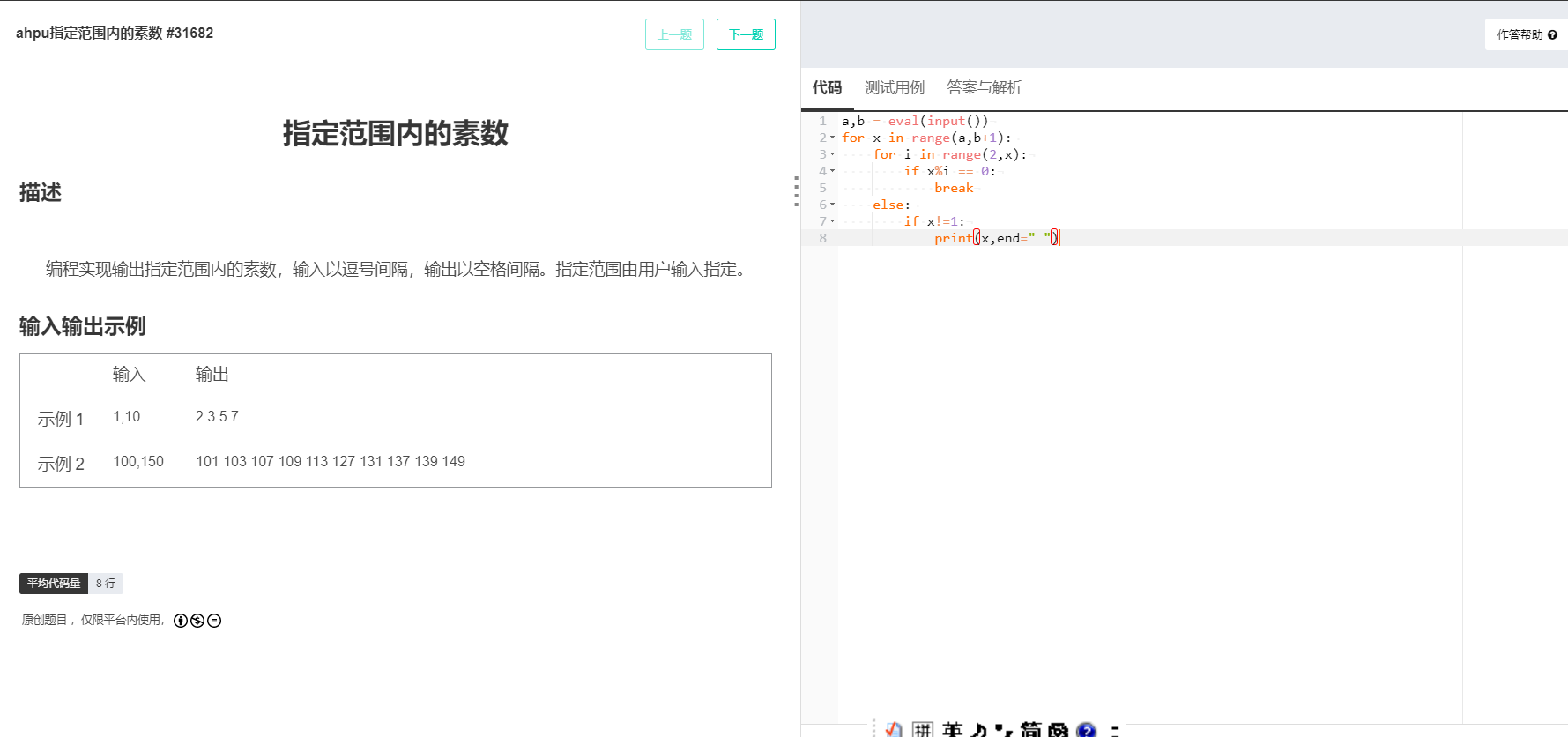 问题分析:找出指定范围的素数,需要使用两个循环结构,内层循环结构是判断某个数是否为素数,外层循环结构是将指定范围内的数逐个遍历。首先确定素数的定义:素数也叫质数,即在正整数中,除1与本身之外没有其他约数的数(1除外)。然后设计外部结构将指定范围内的数逐个遍历,再设计内层结构判断正在遍历的数是否为素数。最后将是素数的数字打印出来。