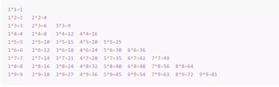 请按照如下格式设计一个“九九乘法口诀表”,并打印出来。