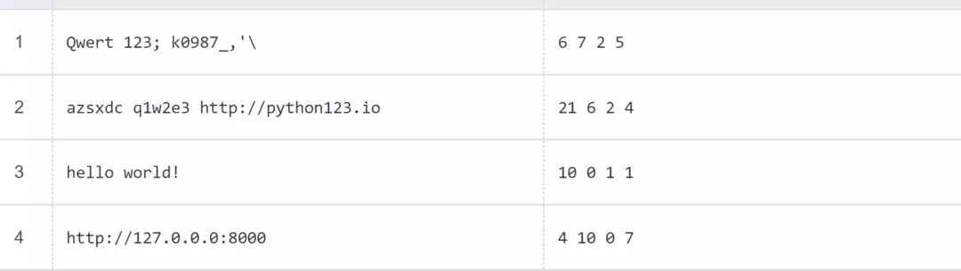输出:按照顺序输出字母,数字,空格,及其他字符的个数,个数以空格分隔