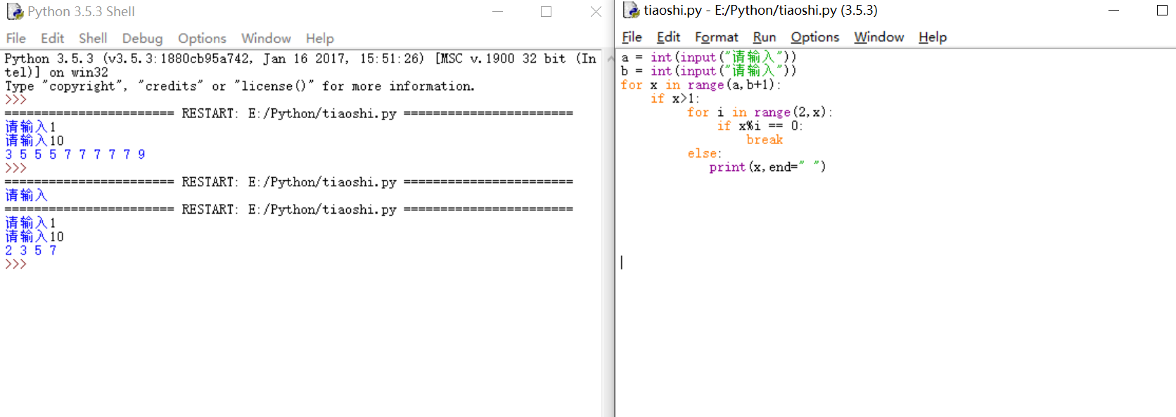 出现以上代码的解释:3,5,7,9为(1,10)区间的素数,当x=3时,该素数无法被2整除,输出3,因为在除数(2,3)中不包含3,则输出结果只有一个3.当x=5时,该素数无法被2,3,4整除,因为在除数(2,5)中不包含5,则输出结果有三个5。以此类推。