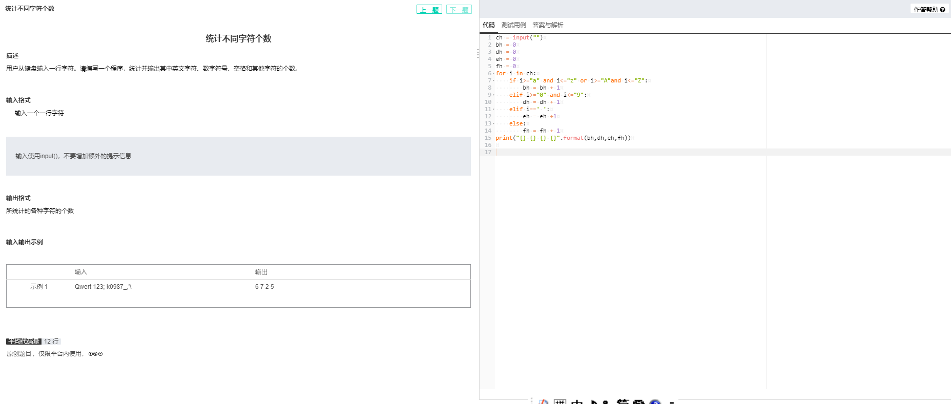 问题分析:判断某个字符是中英文字符还是空格符还是数字符号还是其他字符,主要通过该字符的大小。通过各个条件判断该字符在哪个范围然后输出。