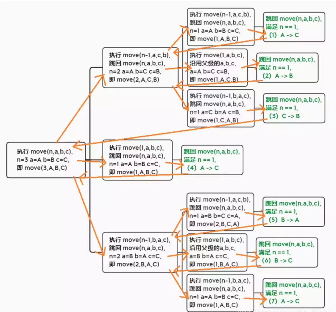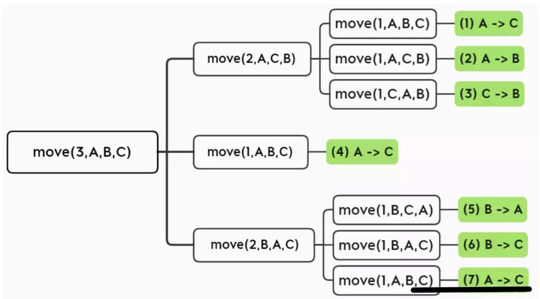 3. 要求将所有的圆盘从最右边的A号柱子全部移动到最左边的C号柱子,且每次只能移动一个圆盘。