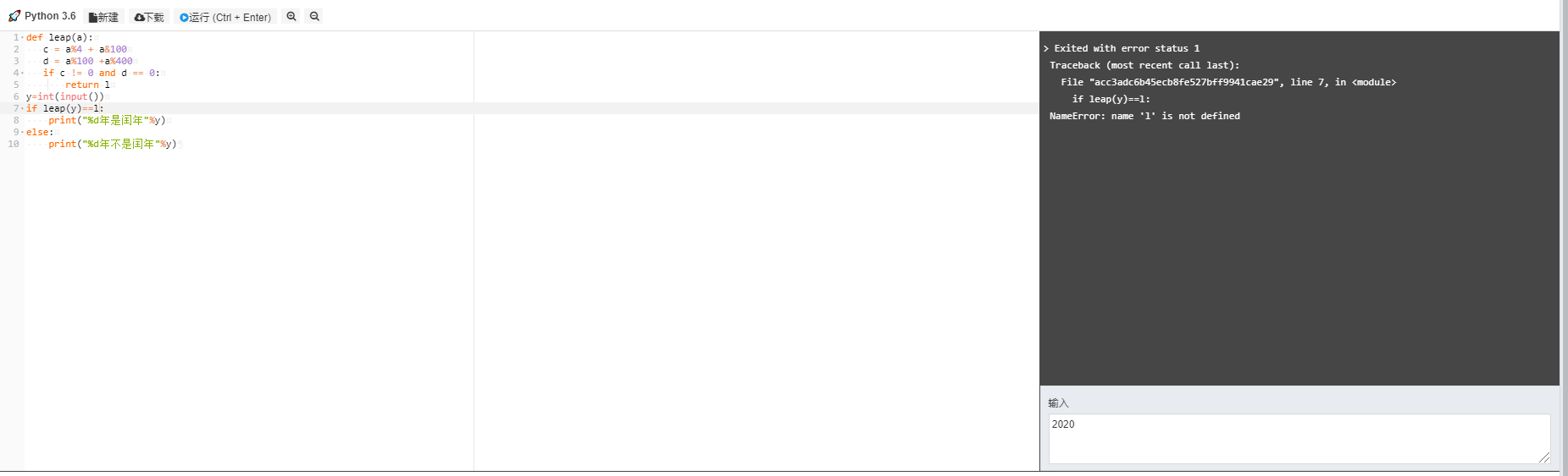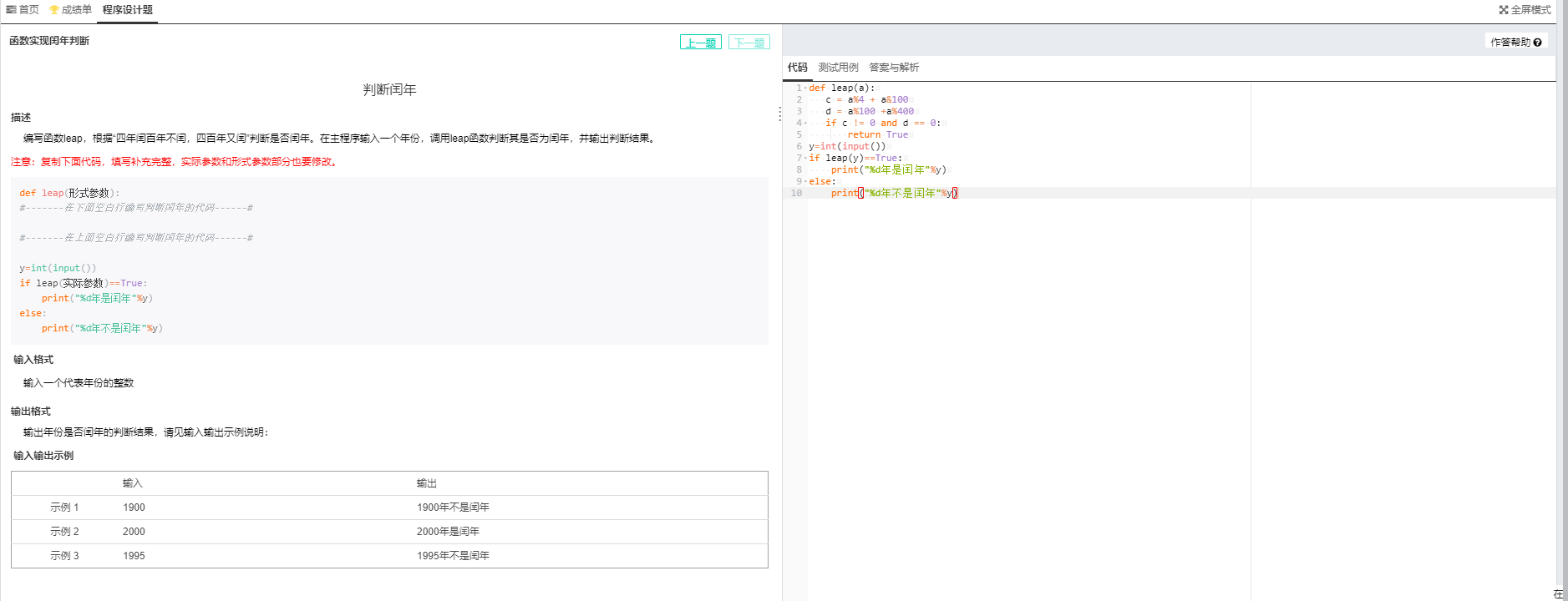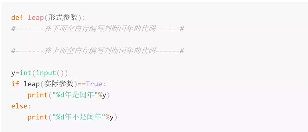 问题分析:明确解题思路,闰年的判断方法是:1.可以被4整除,但不能被100整除,2.可以被400整除。即只要满足这两个条件的任意一个皆可称之为闰年。使用了int函数,目的在于将字符串转化为整数。把闰年的判断条件写在函数内,符合条件使得其输出为True,再用if,else,判断函数返回是否为True,即可对应输出结果。
