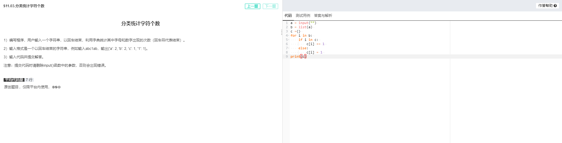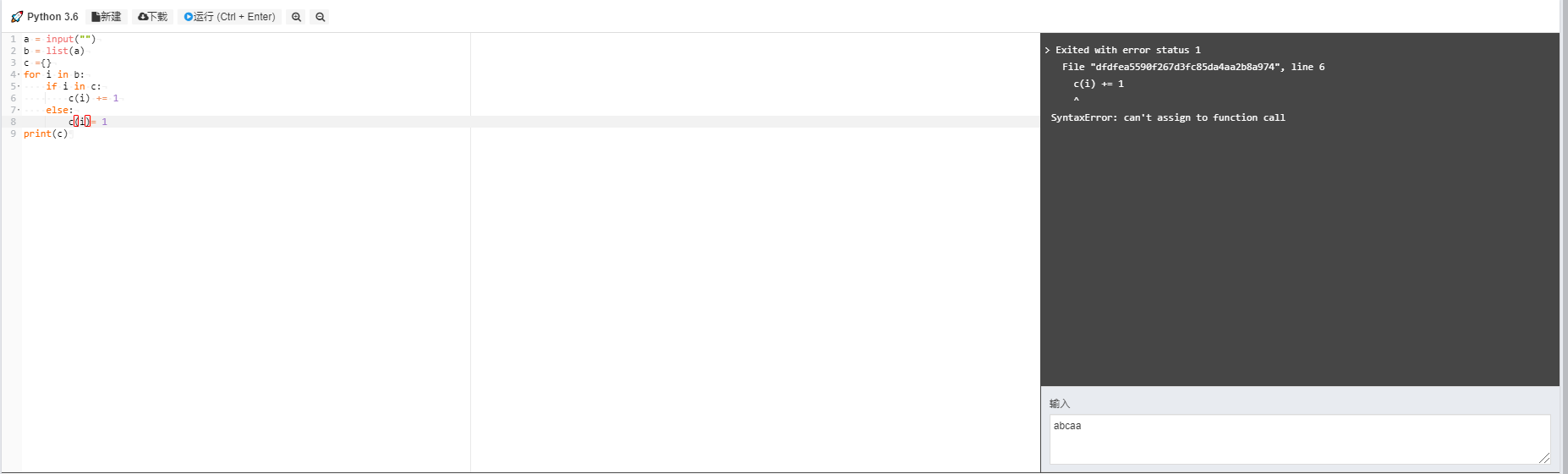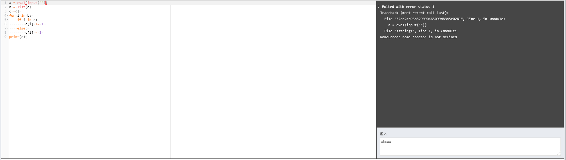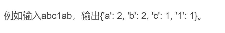 2)输入格式是一个以回车结束的字符串,例如输入abc1ab,输出{'a': 2, 'b': 2, 'c': 1, '1': 1}。