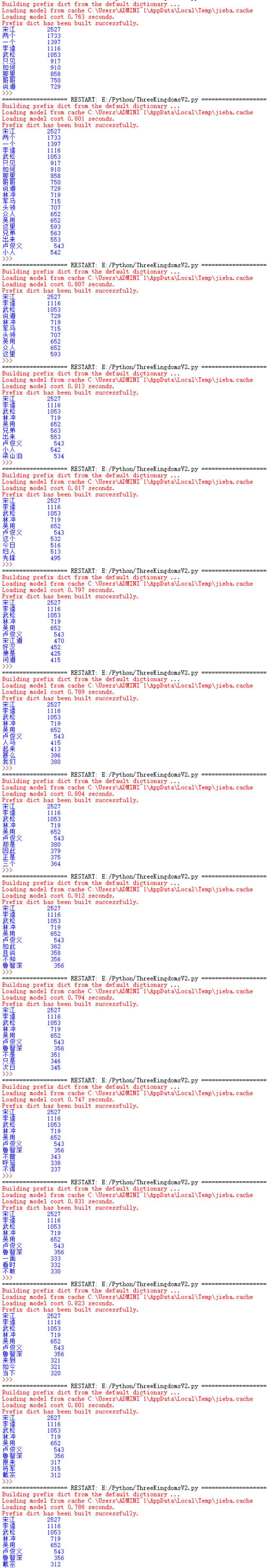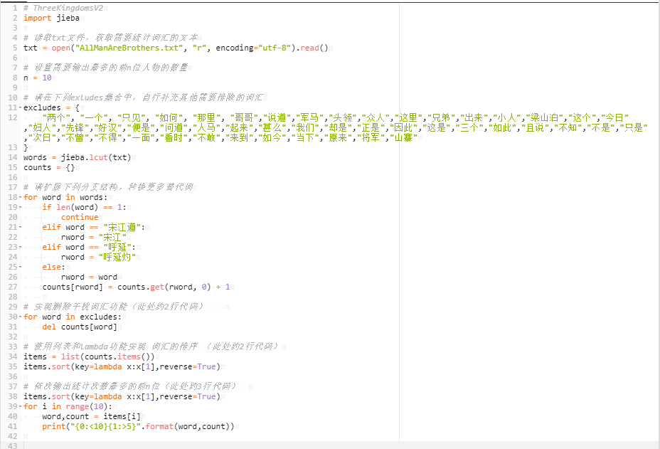 问题分析:题目要求为:统计出场次数最多的10个人物的姓名,而简单的通过jieba库分词所统计的词语中可能会出现非人名或者是同一个人物有不同的名称导致统计该人物出场的次数有误。首先利用jieba库进行分词,再通过不断地调试运行得到非人名的词语,并利用集合排除这些词语。又因为同一个人物可能有不同的名称或者分词中出现单个词,利用循环结构去除单个词以及添加这些人物的其他名称,便于统计人物出场次数。