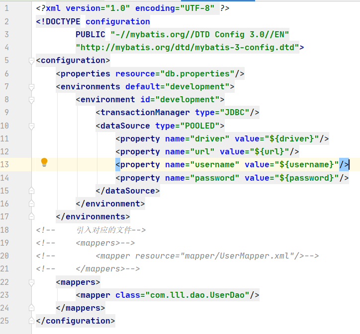 (2)在 MyBatis 的配置文件(通常是 mybatis.xml)中引入该属性文件,添加如下内容: