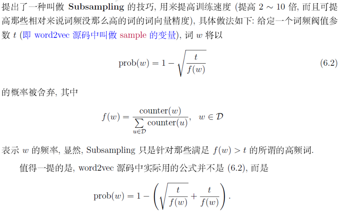 对于语料中的高频词,Mikolov选择对它们进行降采样(sub-samplig),高频词在语料中的出现次数比较多,而且高频词一般而言都不是决定附近词语的词,比如“的”这种停用词。所以对高频词进行降采样既不影响模型效果,又能提升收敛速度。