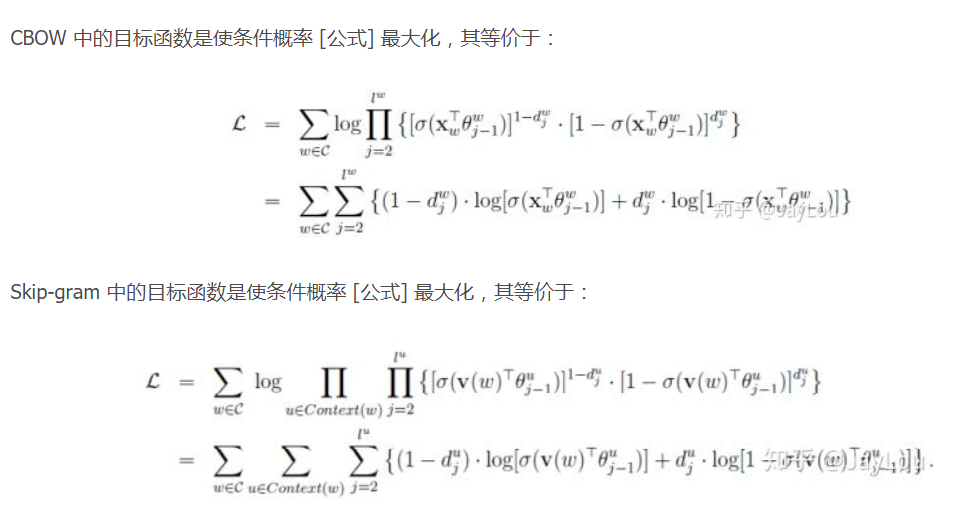 考虑到 sofmax 归一化需要遍历整个词汇表,采用 hierarchical softmax 和 negative sampling 进行优化,hierarchical softmax 实质上生成一颗带权路径最小的哈夫曼树,让高频词搜索路劲变小;negative sampling 更为直接,实质上对每一个样本中每一个词都进行负例采样;