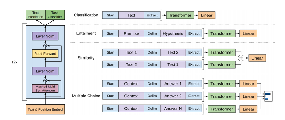 如图所示,输入的语句有 Start + text + Extract,则经过transformer后的Extract向量作为输出,经过linear层和softmax层去进行判断
