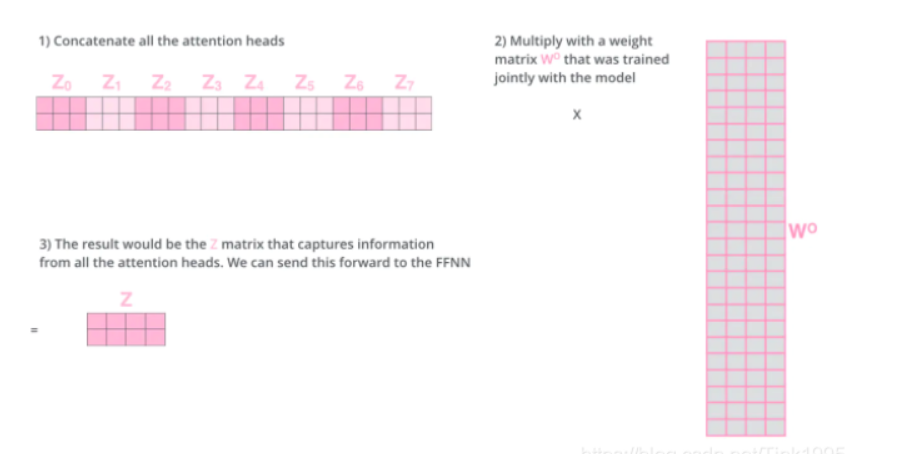 然后通过self-attention计算Z,这样我们就得到了12个Z,然后将12个Z拼接成一个大的矩阵12个(512,64)拼接成(512,768)的大