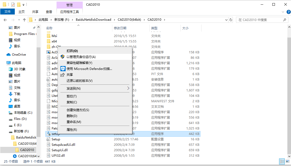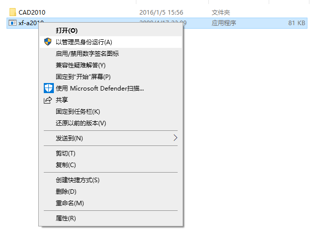 22.打开安装包解压后的【CAD2010】文件夹,鼠标右击【xf-a2010】选择【以管理员身份运行】。