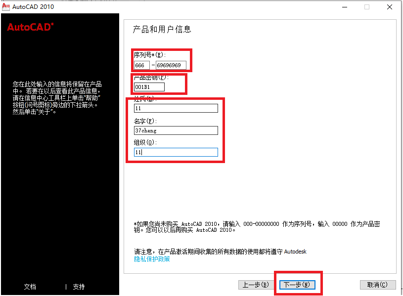 7.输入序列号【666-69696969】,输入产品密钥【001B1】,输入【姓氏、名字、组织】(可随便填写),点击【下一步】。