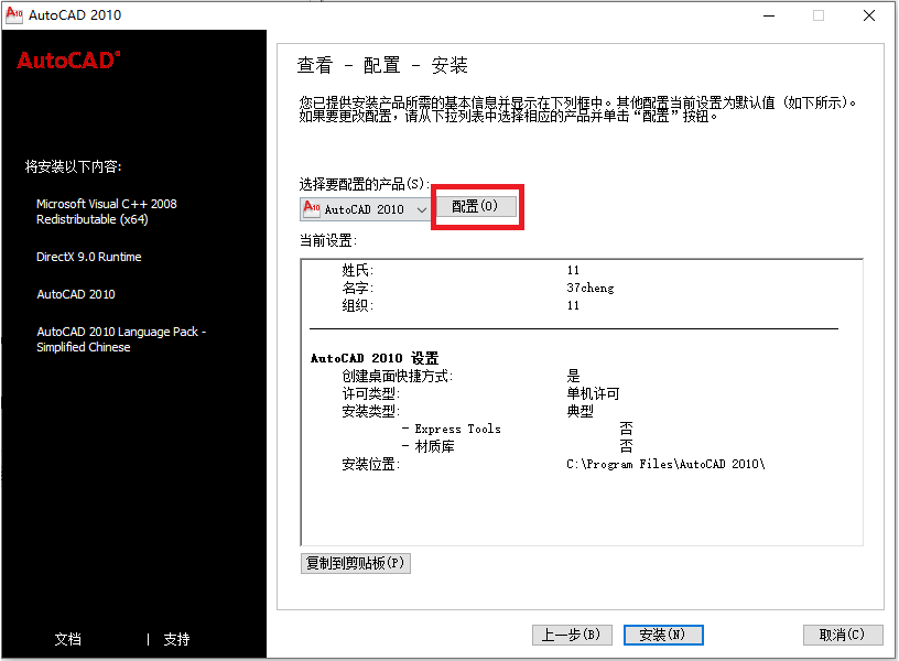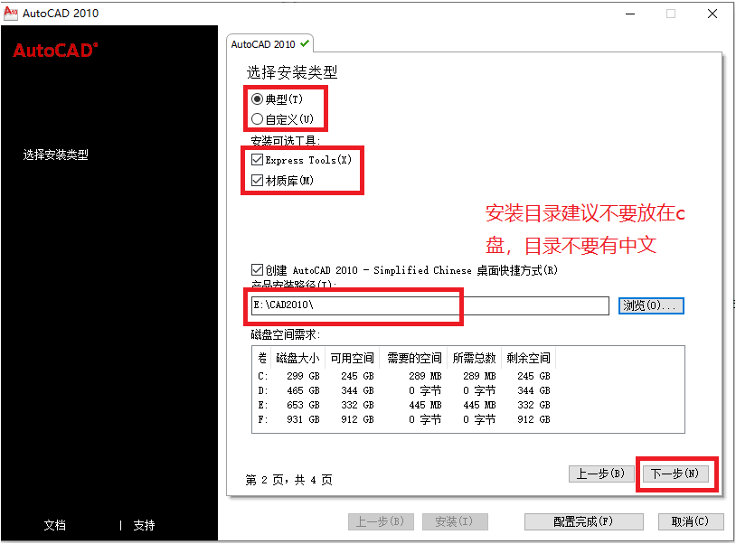 10.选择安装类型【典型】,勾选【Express Tools】和【材质库】,点击【浏览】可更改安装位置(建议不要安装在C盘,可以在D盘或其它磁盘下新建一个“CAD2010”文件夹。注:安装路径中不能有中文),点击【下一步】。