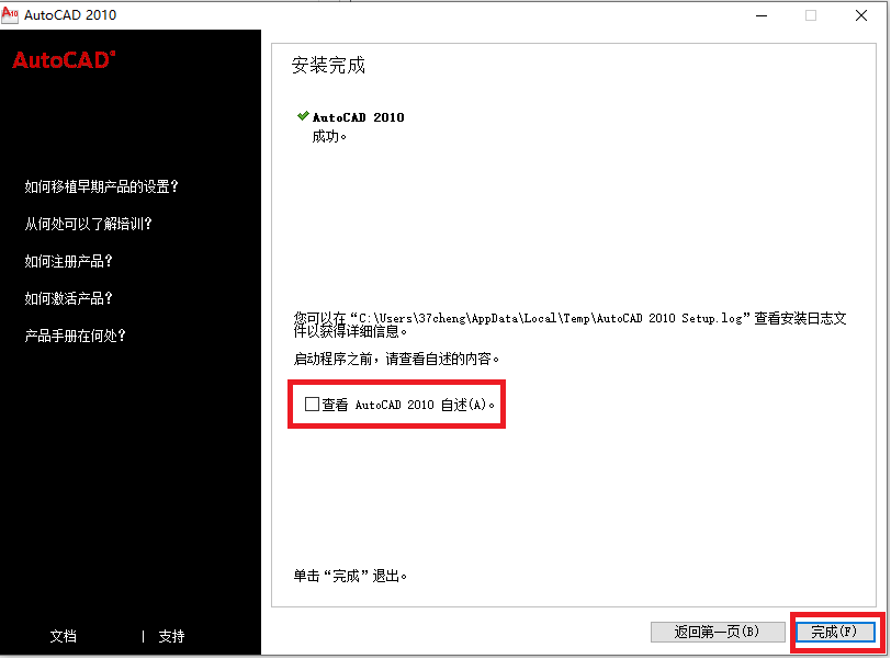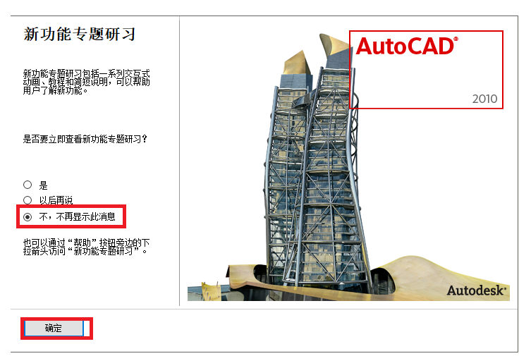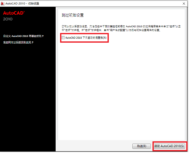 19.取消勾选【AutoCAD 2010下次启动时提醒我】,点击【启动AutoCAD 2010】。