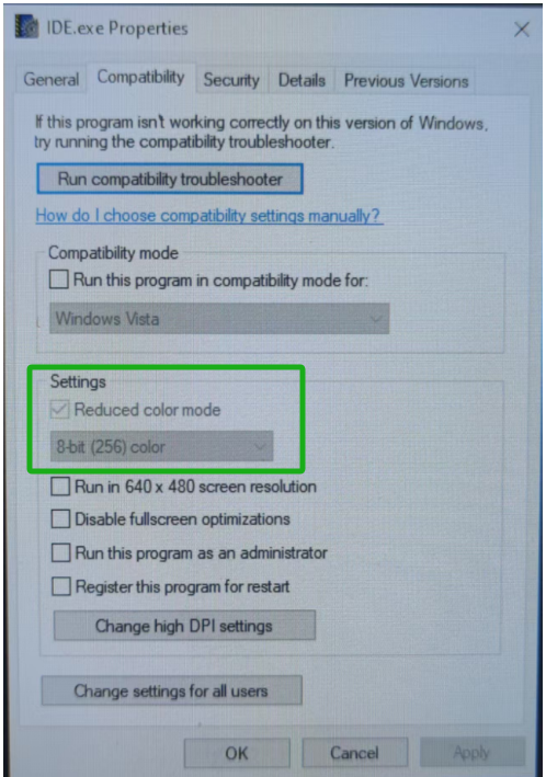 在IDE.exe上右键后,兼容性选项卡,勾选Reduced color mode,8bit-256即可,也可在Change settings for all users里勾选。