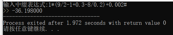 #include <stdio.h> #include <stdlib.h> #include <math.h> #define OK 1 #define DEFEAT 0 #define STACK_INIT_SIZE 15 typedef int Status; // 这个栈存放运算符 typedef struct sqStack { char *top; char *base; int stack_size; } sqStack; // 这个栈存放待运算的数 typedef struct resStack { double *top; double *base; int stack_size; } resStack; void initSqStack(sqStack *stack); void initResStack(resStack *stack); void ePush(sqStack *symbol_stack, char e); void resStackCalc(resStack *res_stack, char e); void point_cnn(resStack *res_stack, char e, int cnt); void highPriority(sqStack *symbol_stack, resStack *res_stack); void destroyStack(sqStack *symbol_stack, resStack *res_stack); void res_stack_push(resStack *res_stack, char e, char previous); void divideStack(sqStack *symbolStack, resStack *res_stack, char e); void lowPriority(sqStack *symbol_stack, resStack *res_stack,char e); void mediumPriority(sqStack *symbol_stack, resStack *res_stack, char e); void m_h_Priority(sqStack *symbol_stack, resStack *res_stack, char e); void symbolPriority(sqStack *symbol_stack, resStack *res_stack, char e); void symbol_stack_push(sqStack *symbol_stack, resStack *res_stack, char e); // 初始化符号栈 void initSqStack(sqStack *stack) { stack->base = (char *)malloc(STACK_INIT_SIZE * sizeof(char)); if (!stack->base) { printf("sqStack初始化失败!\n"); exit(1); } stack->top = stack->base; stack->stack_size = STACK_INIT_SIZE; } // 初始化数字栈 void initResStack(resStack *stack) { stack->base = (double *)malloc(STACK_INIT_SIZE * sizeof(double)); if (!stack->base) { printf("resStack初始化失败!\n"); exit(1); } stack->top = stack->base; stack->stack_size = STACK_INIT_SIZE; } // 区分符号与数字 void divideStack(sqStack *symbol_stack, resStack *res_stack, char e) { static Status flag = 0; // 记录前边有没有小数点 static int cnt = 0; // 记录小数点后数字的个数 static char previous; // 记录上一个字符 if (e == 46) { flag = 1; return; } if (e >= 48 && e <= 57) { if (flag) // 如果为 1 则前面有小数点。 { cnt ++; point_cnn(res_stack, e, cnt); } else { res_stack_push(res_stack, e, previous); } } else { flag = cnt = 0; symbol_stack_push(symbol_stack, res_stack, e); } previous = e; //printf("%f\n",*(res_stack->top)); } // 把能直接压栈的情况全写在这里 void symbol_stack_push(sqStack *symbol_stack, resStack *res_stack, char e) { // 如果栈为空或者当前符号为左括号,则直接压栈 if (symbol_stack->top == symbol_stack->base || e == '(') { *(symbol_stack->top) = e; symbol_stack->top ++; } // 如果栈顶符号为左括号,则直接压栈 else if (*(--symbol_stack->top) == '(') { symbol_stack->top ++; *(symbol_stack->top) = e; symbol_stack->top ++; } else { symbol_stack->top ++; symbolPriority(symbol_stack, res_stack, e); } } // 判断符号优先级 void symbolPriority(sqStack *symbol_stack, resStack *res_stack, char e) { /* 既然已经进到 symbolPriority 函数了, 那就说明栈不为空,栈顶符号不为左括号, 当前符号不是左括号 */ if (e == '+' || e == '-') { lowPriority(symbol_stack, res_stack, e); } else if (e == '*' || e == '/') { mediumPriority(symbol_stack, res_stack, e); } else if (e=='^') { m_h_Priority(symbol_stack,res_stack,e); } else // e 为 右括号的情况 { highPriority(symbol_stack, res_stack); } } // 清空括号内的符号 void highPriority(sqStack *symbol_stack, resStack *res_stack) { do { symbol_stack->top --; if (*(symbol_stack->top) == '(') { break; } //printf("resStackCalc外的准备进入resStackCalc\n"); resStackCalc(res_stack, *(symbol_stack->top)); //printf("resStackCalc外的已经退出resStackCalc\n"); } while (symbol_stack->top != symbol_stack->base); } // 高优先级符号入栈 void mediumPriority(sqStack *symbol_stack, resStack *res_stack, char e) { do { symbol_stack->top --; if (*(symbol_stack->top) == '(') { break; } // 防止栈底符号被覆盖 if (*(symbol_stack->top) == '+' || *(symbol_stack->top) == '-') { symbol_stack->top ++; *(symbol_stack->top) = e; symbol_stack->top ++; return; } resStackCalc(res_stack, *(symbol_stack->top)); } while (symbol_stack->top != symbol_stack->base); // 将优先级大于等于 e 的弹出之后压入栈中。 ePush(symbol_stack, e); } void m_h_Priority(sqStack *symbol_stack, resStack *res_stack, char e) { do { symbol_stack->top --; if (*(symbol_stack->top) == '(') { break; } // 防止栈底符号被覆盖 if (*(symbol_stack->top) == '+' || *(symbol_stack->top) == '-'||*(symbol_stack->top) == '*'||*(symbol_stack->top) == '/') { symbol_stack->top ++; *(symbol_stack->top) = e; symbol_stack->top ++; return; } //printf("resStackCalc外的准备进入resStackCalc\n"); resStackCalc(res_stack, *(symbol_stack->top)); //printf("resStackCalc外的已经退出resStackCalc\n"); } while (symbol_stack->top != symbol_stack->base); // 将优先级大于等于 e 的弹出之后压入栈中。 ePush(symbol_stack, e); } // 低优先级符号入栈 void lowPriority(sqStack *symbol_stack, resStack *res_stack, char e) { // printf("标记1:低优先级符号入栈,%c\n",e); do { symbol_stack->top --; // printf("%c\n",*(symbol_stack->top)); if (*(symbol_stack->top) == '(') { // printf("标记2:do while的break\n"); break; } //printf("resStackCalc外的准备进入resStackCalc\n"); resStackCalc(res_stack, *(symbol_stack->top)); // printf("resStackCalc外的已经退出resStackCalc\n");5+(2+3^2)/(9-(5*6-4)) } while (symbol_stack->top != symbol_stack->base); // 将优先级大于等于 e 的弹出之后压入栈中。 ePush(symbol_stack, e); } /* 把栈内优先级大于等于e的符号弹完后,进入这个函数只有两种情况, 1. 遇到左括号 (需要top指针先++ 再压栈) 2. 到栈底了 (直接压栈) */ void ePush(sqStack *symbol_stack, char e) { //printf("进入ePush\n"); if (symbol_stack->top == symbol_stack->base) // 栈底 { *(symbol_stack->top) = e; symbol_stack->top ++; } else // 左括号 { symbol_stack->top ++; *(symbol_stack->top) = e; symbol_stac