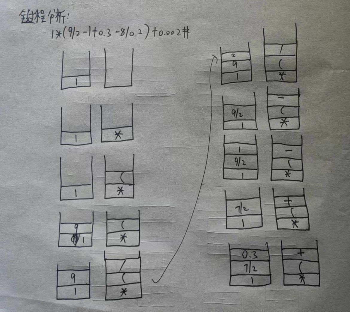 输入一个表达式,扫描该表达式,遇到数直接压入数字栈,遇到符号压入符号栈(判断优先级)。符号栈弹出符号的时候,拿数字栈上边两个元素做该符号的运算,计算出的结果再次压入数字栈。直到scanf 读取到 '#' 时候,扫描结束,此时把栈内剩余的符号弹出,再次进行计算,最后放在数字栈栈底的元素就是该表达式的结果。