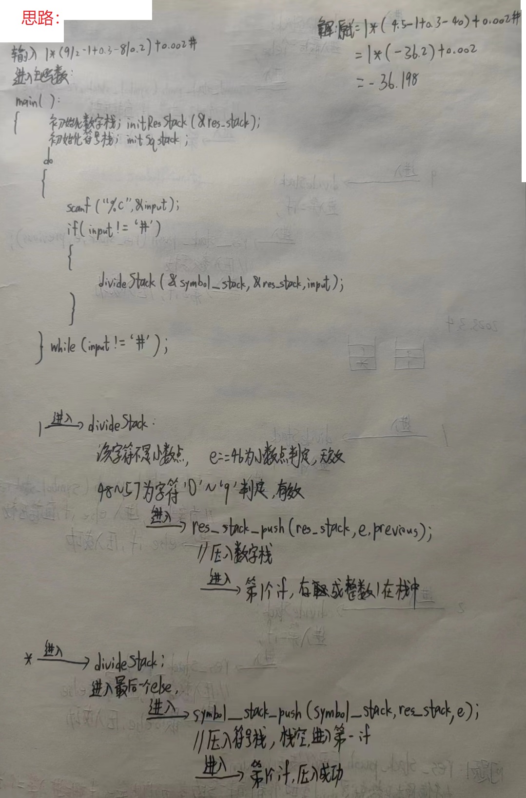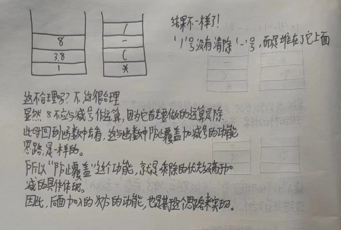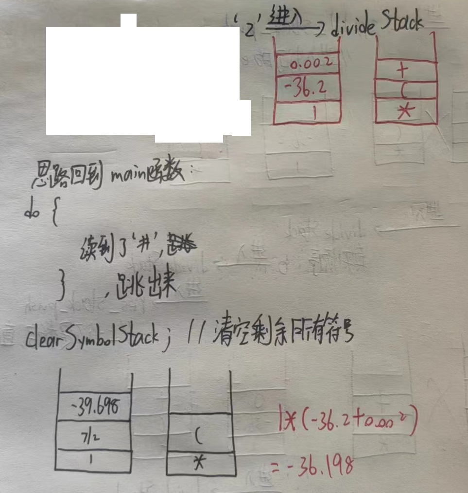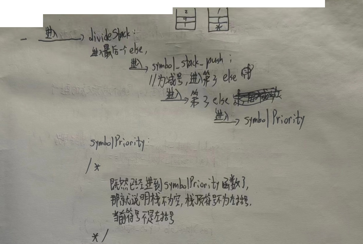 void initSqStack(sqStack *stack);//初始化符号栈,没啥值得讲的 void initResStack(resStack *stack);//初始化数字栈,没啥值得讲的 void ePush(sqStack *symbol_stack, char e); /* 将新的运算符压入栈,原注释写到:走到这里是遇到了左括号或到了栈底,这里实际上需要我们关注的是“遇到了左括号”的这种情况, 后面的三种Priority函数功能是负责将运算符“入栈”——“运算”——“弹出”,同时其运算自带清除栈中积压的运算符功能, 因此在程序中许多情况是左括号之上的运算符清空了之后, 新的运算符遇到左括号进入此函数而再次被压入栈的(至于为什么要清空左括号上面,是因为左右括号比加减乘除的优先级高), 而到栈底的情况自然没什么好讲的 */ void resStackCalc(resStack *res_stack, char e);//用 下边的数 运算符 上边的数,没有太难的地方 void point_cnn(resStack *res_stack, char e, int cnt);//小数点的处理,不难理解 void highPriority(sqStack *symbol_stack, resStack *res_stack);//右括号是最高优先级,自带清除积压功能 void destroyStack(sqStack *symbol_stack, resStack *res_stack);//销毁栈,没啥好讲的 void res_stack_push(resStack *res_stack, char e, char previous);//将数字压入数字栈,没有太难的地方 void divideStack(sqStack *symbolStack, resStack *res_stack, char e);//对数字入栈和运算符入栈的区分处理 void lowPriority(sqStack *symbol_stack, resStack *res_stack,char e);//加减,低优先级,自带清除积压功能 void mediumPriority(sqStack *symbol_stack, resStack *res_stack, char e);//乘除,中优先级,自带清除积压功能 void symbolPriority(sqStack *symbol_stack, resStack *res_stack, char e);//判断运算符的优先级,不同优先级运算符入栈时的具体处理是不一样的 void symbol_stack_push(sqStack *symbol_stack, resStack *res_stack, char e);//将符号压入符号栈,按实际情况直接压入,或激活其清除积压运算符的功能 void clearSymbolStack(sqStack *symbol_stack, resStack *res_stack)// 把符号栈内剩余的符号弹出, 进行计算