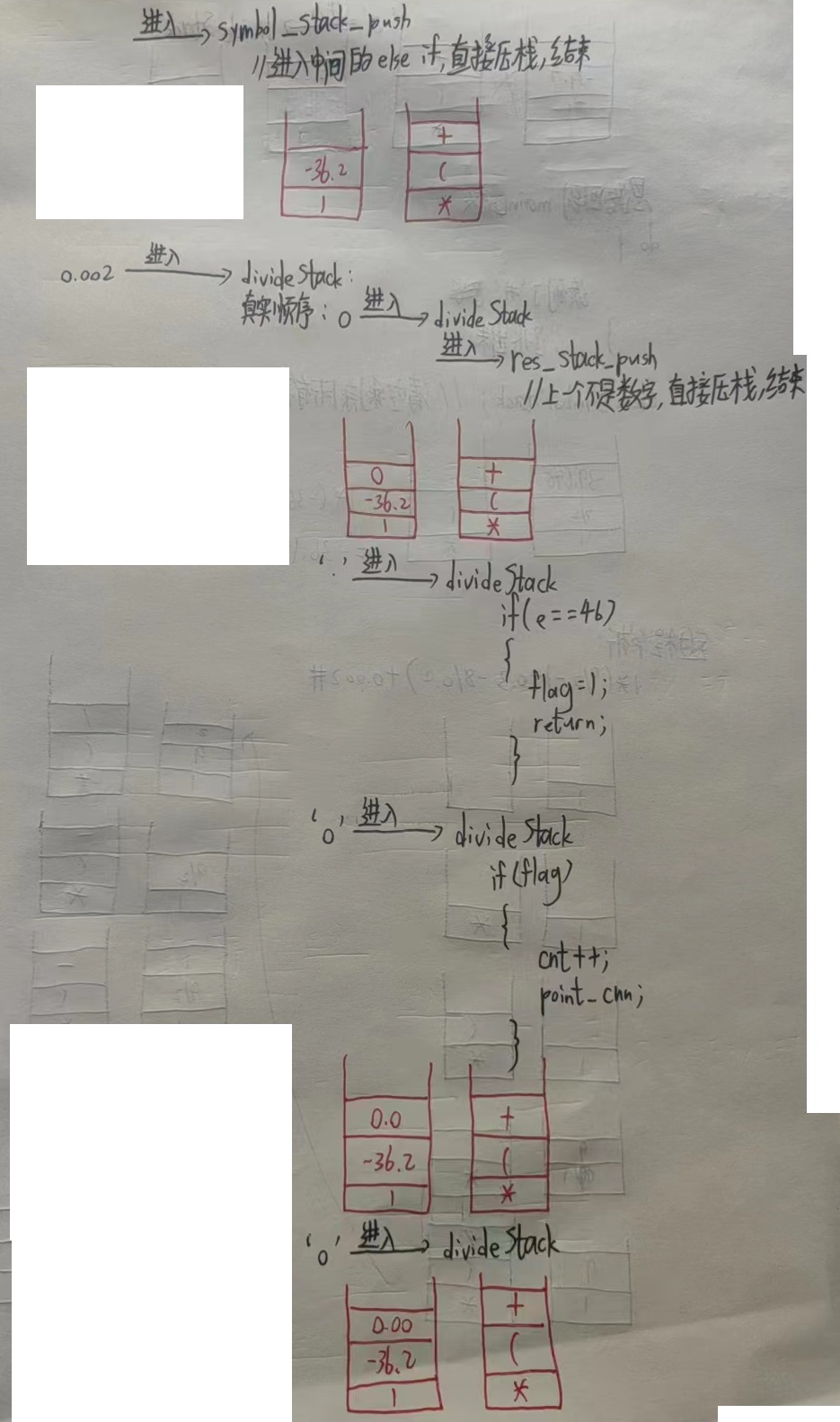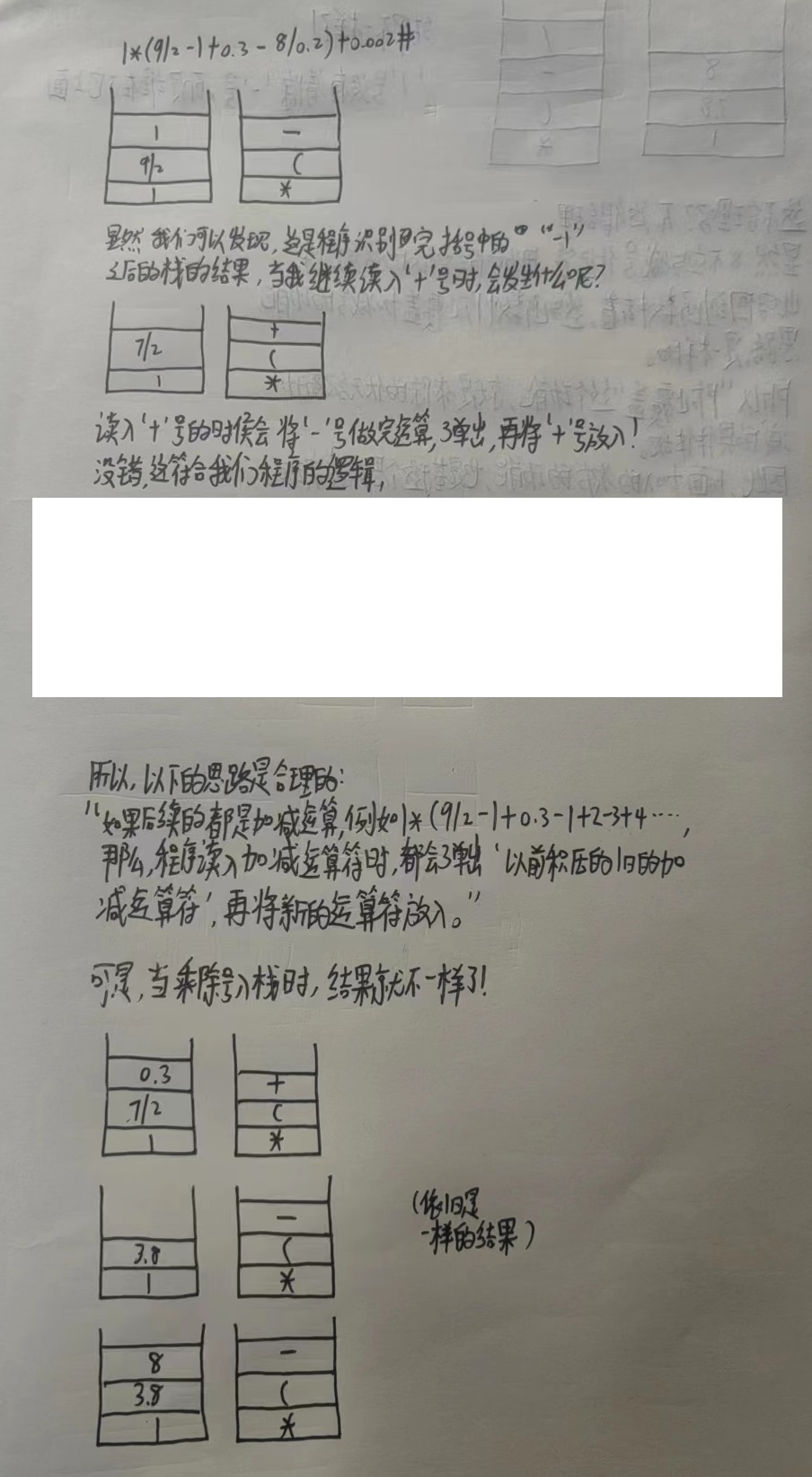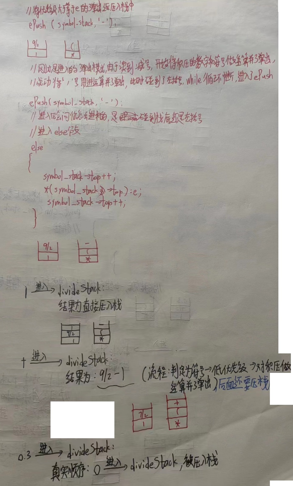 void m_h_Priority(sqStack *symbol_stack, resStack *res_stack, char e) { do { symbol_stack->top --; if (*(symbol_stack->top) == '(') { break; } // 防止栈底符号被覆盖 if (*(symbol_stack->top) == '+' || *(symbol_stack->top) == '-'||*(symbol_stack->top) == '*'||*(symbol_stack->top) == '/') { symbol_stack->top ++; *(symbol_stack->top) = e; symbol_stack->top ++; return; } //printf("resStackCalc外的准备进入resStackCalc\n"); resStackCalc(res_stack, *(symbol_stack->top)); //printf("resStackCalc外的已经退出resStackCalc\n"); } while (symbol_stack->top != symbol_stack->base); // 将优先级大于等于 e 的弹出之后压入栈中。 ePush(symbol_stack, e); }