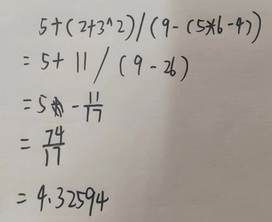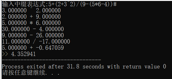 void resStackCalc(resStack *res_stack, char e) { // 计算的时候是用 下边的数 运算符 上边的数 double b = *(--res_stack->top); double a = *(--res_stack->top); printf("%f %c %f\n",a,e,b); switch (e) { case '+': *(res_stack->top) = a+b; //printf("*(res_stack->top)=%f\n",*(res_stack->top)); break; case '-': *(res_stack->top) = a-b; break; case '*': *(res_stack->top) = a*b; break; case '/': *(res_stack->top) = a/b; break; case '^': *(res_stack->top) = pow(a,b);break; // } // 压栈完毕之后, top指针需要往上走一步 res_stack->top ++; }