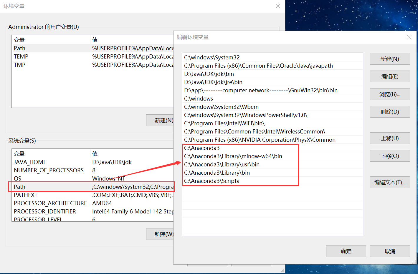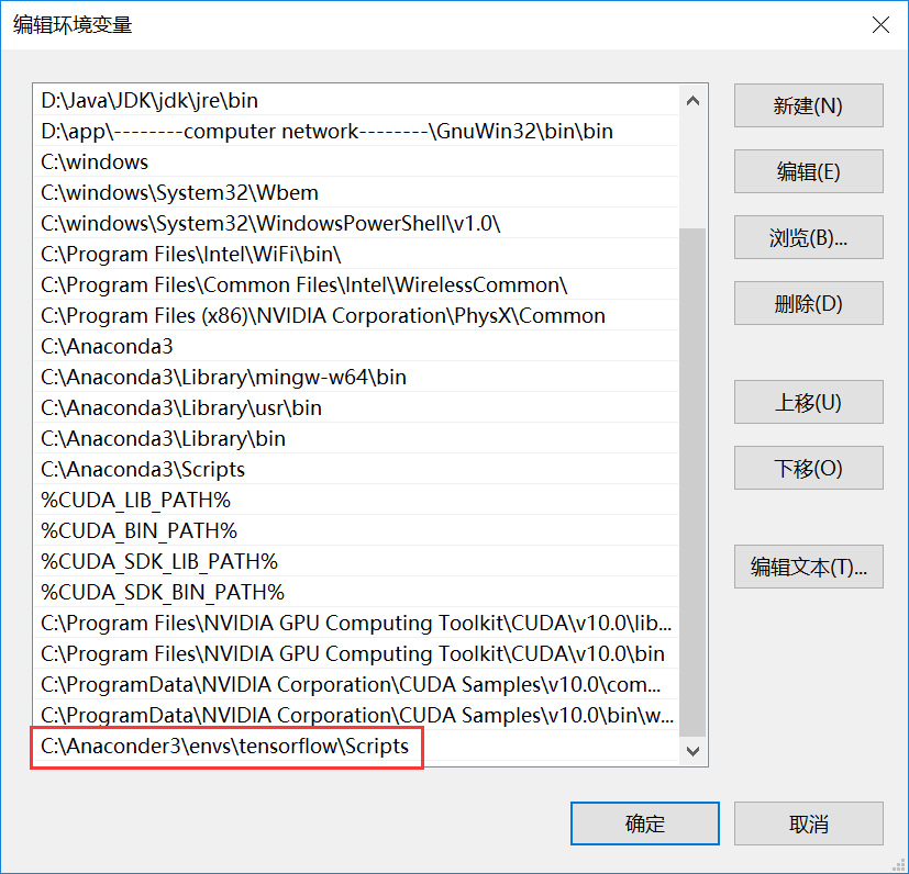 于是便将C:\Anaconder3\envs\tensorflow\Scripts添加到path里。