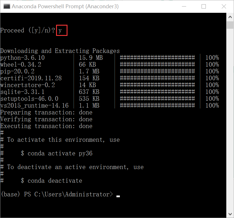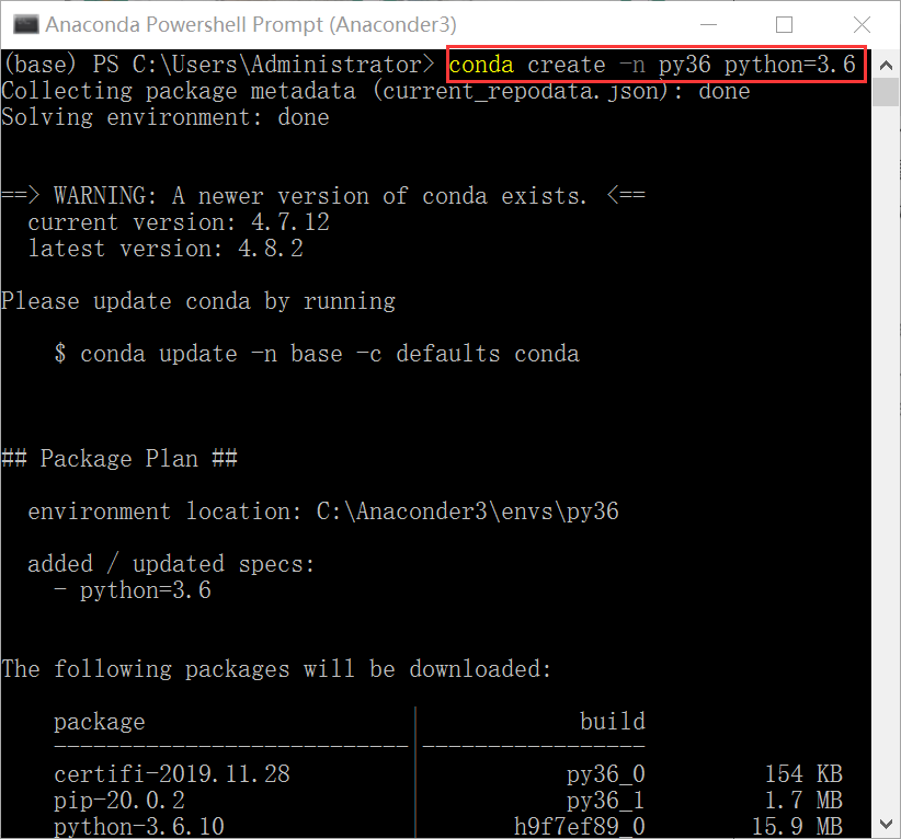 (1)创建一个名为 py36 的环境,指定 Python 版本是 3.6(不用管是 3.6.x,conda 会为我们自动寻找 3.6.x 中的最新版本)