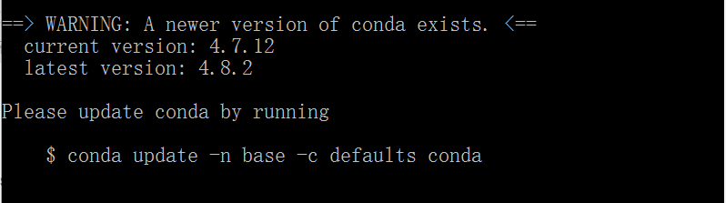 刚才安装的时候出现了警告,意思是conda版本太低了。