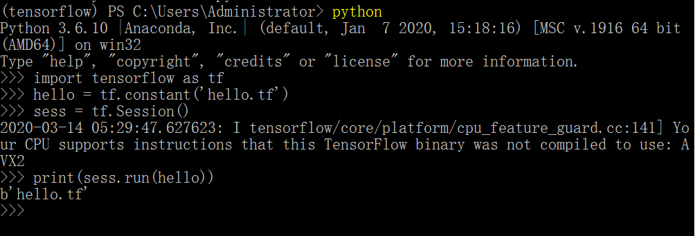 查了下是:你下载的TensorFlow太low了,根本没有通过兼容AVX来Compile。如果您下载源代码在该电脑上重新compile,就可以支持AVX。其实你的 CPU 支持AVX AVX2,但你安装的 TensorFlow 版本不支持。