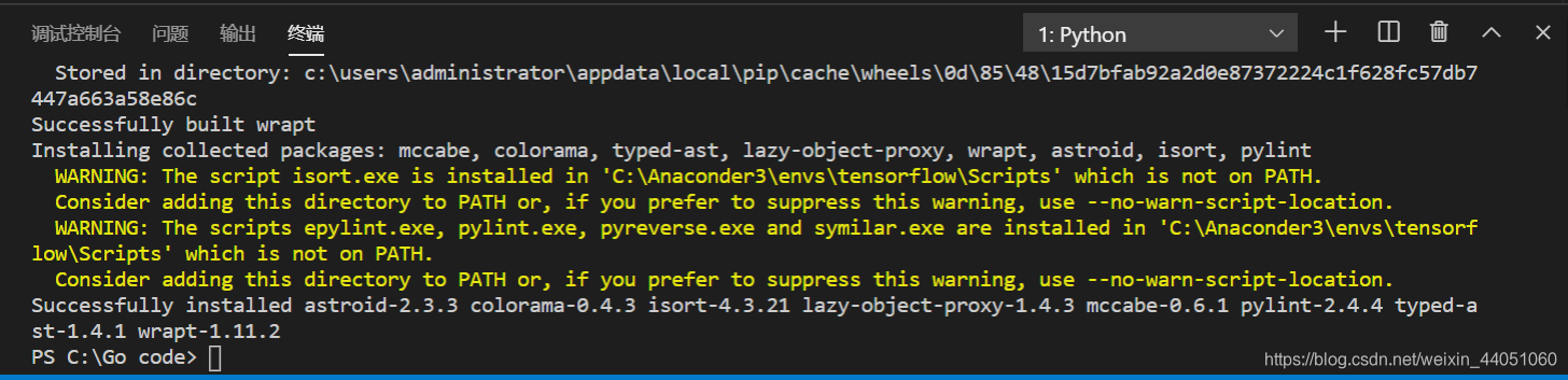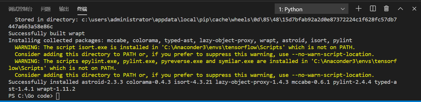 WARNING: The scripts epylint.exe, pylint.exe, pyreverse.exe and symilar.exe are installed in ‘C:\Anaconder3\envs\tensorflow\Scripts’ which is not on PATH.