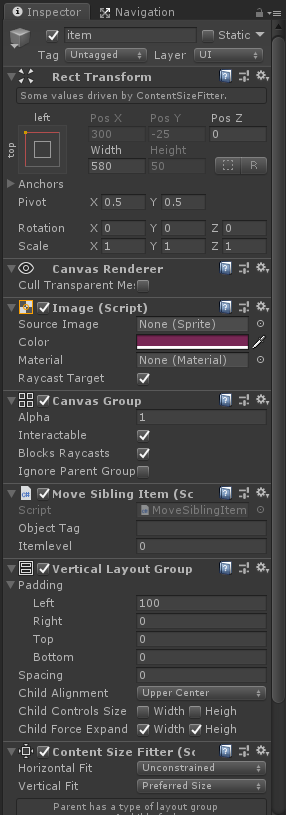RefreshContentSizeFitter(); } public void OnDrag(PointerEventData eventData) { itemCanvasGroup.blocksRaycasts = false; DragPos(eventData); } public void OnEndDrag(PointerEventData eventData) { OnPointerEnter(eventData); itemCanvasGroup.blocksRaycasts = true; itemCanvasGroup.alpha = 1; isDragging = false; } public void OnPointerEnter(PointerEventData eventData) { if (eventData.pointerCurrentRaycast.depth == 0 && isDragging == true) { SetLastPos(); return; } objectTag = eventData.pointerCurrentRaycast.gameObject.tag; if (objectTag != null && isDragging == true) { Debug.Log("放置位置:" + eventData.pointerCurrentRaycast.gameObject.name); MoveSiblingItem hitItem = eventData.pointerCurrentRaycast.gameObject.GetComponent<MoveSiblingItem>(); if (hitItem != null) { if (itemlevel <= hitItem.itemlevel) { Transform aimParent = eventData.pointerCurrentRaycast.gameObject.transform.parent; while (true) { MoveSiblingItem aimParentSiblingItem = aimParent.GetComponent<MoveSiblingItem>(); if (aimParentSiblingItem == null) { break; } else { if (itemlevel > aimParentSiblingItem.itemlevel) { break; } else { hitItem = aimParentSiblingItem; aimParent = aimParent.parent; } } } itemSelf.transform.SetParent(aimParent); itemSelf.transform.SetSiblingIndex(hitItem.transform.GetSiblingIndex()); } else { itemSelf.transform.SetParent(eventData.pointerCurrentRaycast.gameObject.transform); } RefreshContentSizeFitter(); } else { SetOriginalPos(itemSelf); } } } public void RefreshContentSizeFitter() { ContentSizeFitter[] csfs = itemRoot.GetComponentsInChildren<ContentSizeFitter>(); foreach (var item in csfs) { LayoutRebuilder.ForceRebuildLayoutImmediate(item.GetComponent<RectTransform>()); } } public void SetLastPos() { itemSelf.transform.SetParent(itemRoot.transform); RefreshContentSizeFitter(); } public void SetOriginalPos(GameObject gameobject) { gameobject.transform.SetParent(originalSlot.transform); if (itemSelf.transform.GetSiblingIndex()== frontIndex) { itemSelf.transform.SetSiblingIndex(0); itemSelf.transform.SetSiblingIndex(frontIndex); } else { itemSelf.transform.SetSiblingIndex(frontIndex); } RefreshContentSizeFitter(); } //获取鼠标当前位置,并赋给item private void DragPos(PointerEventData eventData) { RectTransform RectItem = itemSelf.GetComponent<RectTransform>(); Vector3 globalMousePos; if (RectTransformUtility.ScreenPointToWorldPointInRectangle(itemSelf.transform as RectTransform, eventData.position, eventData.pressEventCamera, out globalMousePos)) { RectItem.position = globalMousePos; } } }