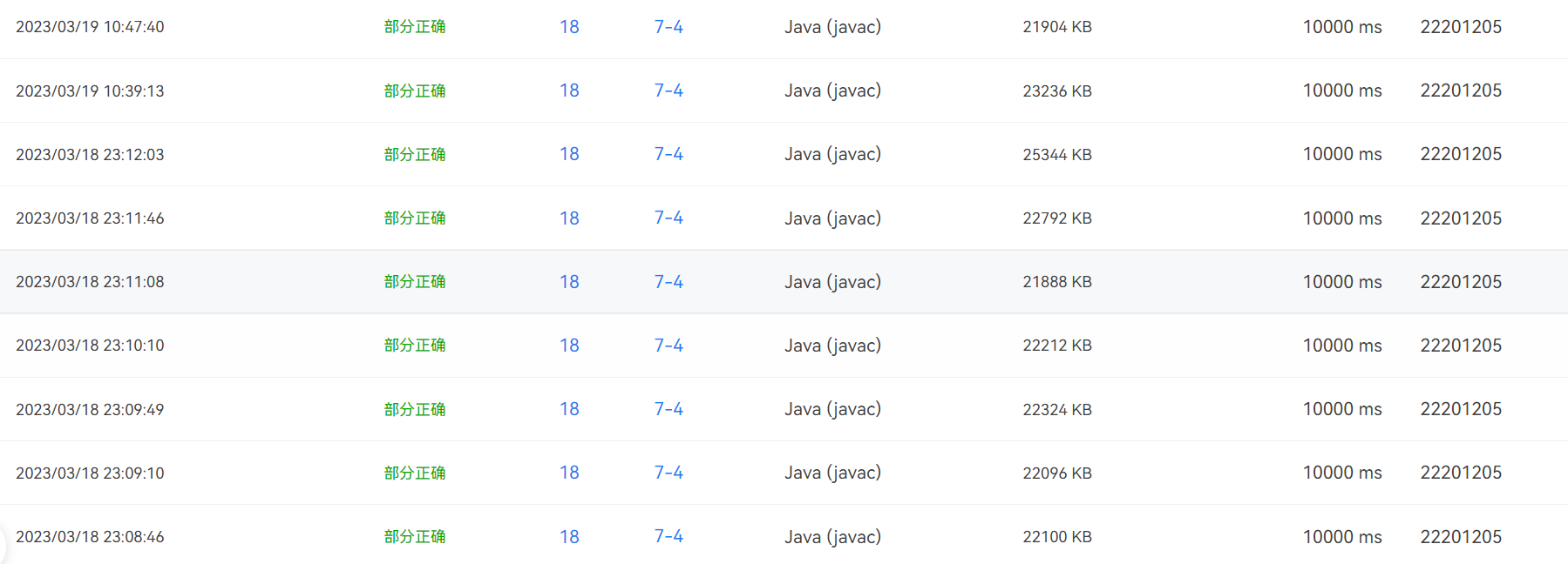 (3)采坑心得:尽量在eclipse上编写代码,利用编译环境的优点,将所有语法错误纠正,并记录下来,以提高效率。而在调试过程中发现测试点不通过时,及时使用debug去进行测试,来达到快速查找逻辑错误出现在何处,而在不知道测试点问题出在哪里时,应该往题目情景中比较特殊的点出发,逐步排查问题,来达到思路清晰的去解决问题,而不是盲目的一个一个点去测试,因为这些你随便测试的点大部分所利用到的算法都是一致的,所以在进行这些重复测试只会让费掉自己的耐心和时间。此下便是无用测试后提交多次却没能解决问题的结果,而且几次提交的时间间隔非常短暂,这也是当时在多次提交后无果失去耐心急于得分的表现。