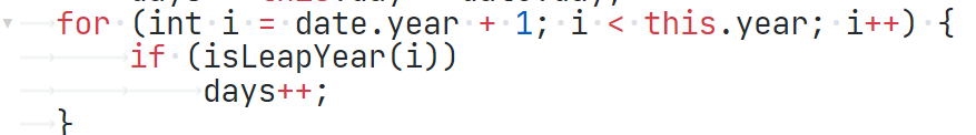 但由于不是每年都是365天,所以我们需要对两日期间的年份进行遍历以计算之间有几个闰年,最后在计算总天数是加上少算的这几天。