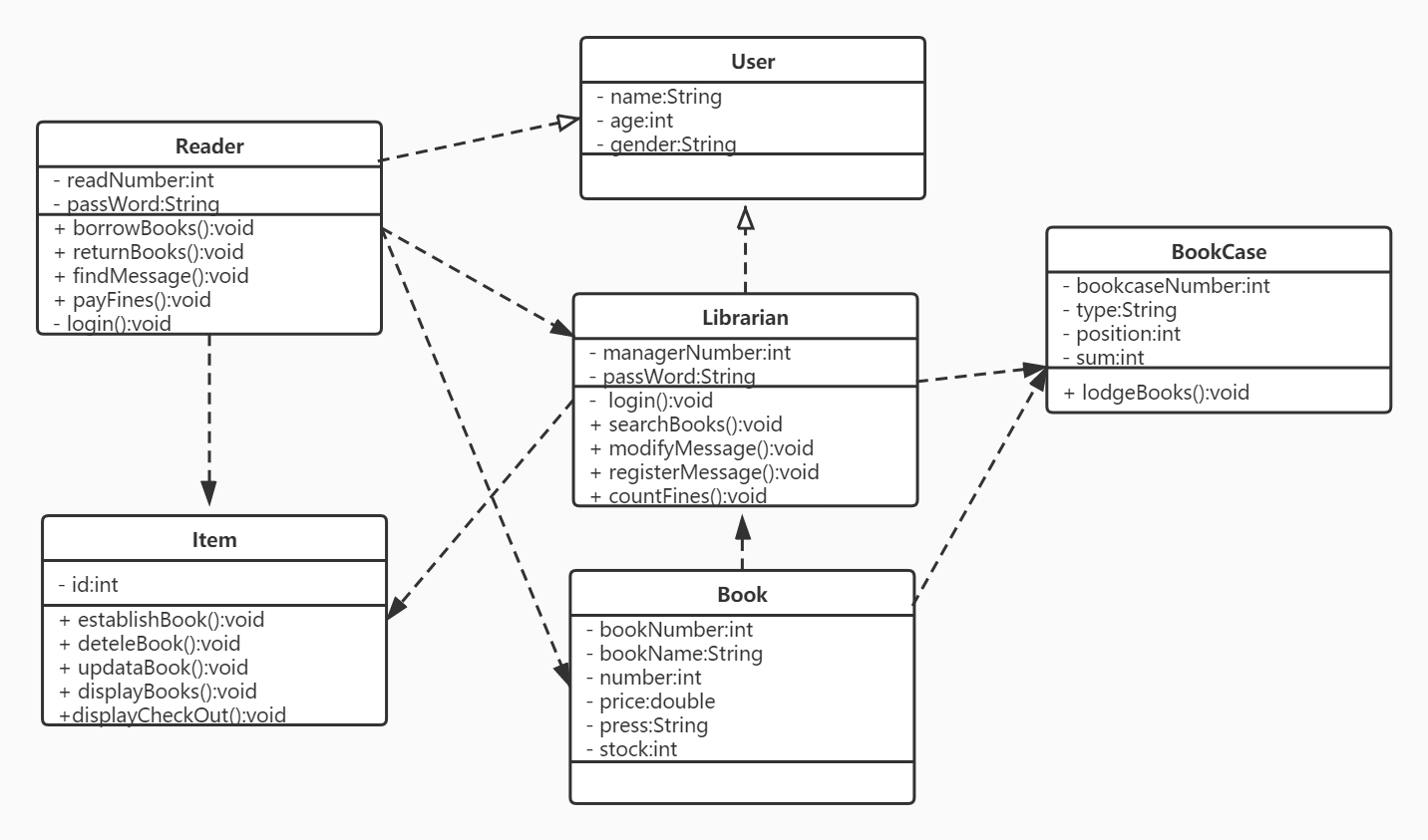 - User类是Reader类和Librarian类的父类,包含用户,年龄和性别三个属性。Reader类和Librarian类继承User类简化了其属性。