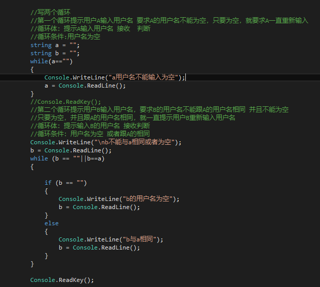 //第一个循环提示用户A输入用户名 要求A的用户名不能为空,只要为空,就要求A一直重新输入