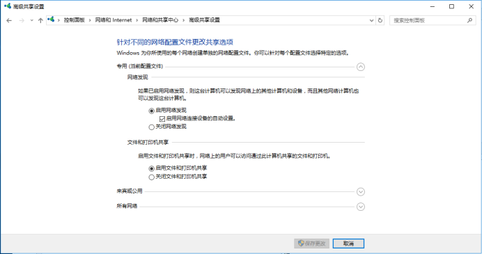 打开Windows sever 2016服务器和所有客户机的网络共享设置:控制面板>所有控制面板项>网络和共享中心>高级共享设置;