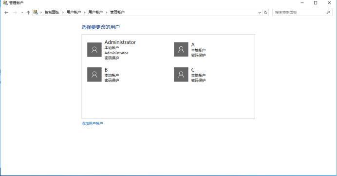 打开控制面板>用户帐户>用户帐户>管理帐户选择添加账户;