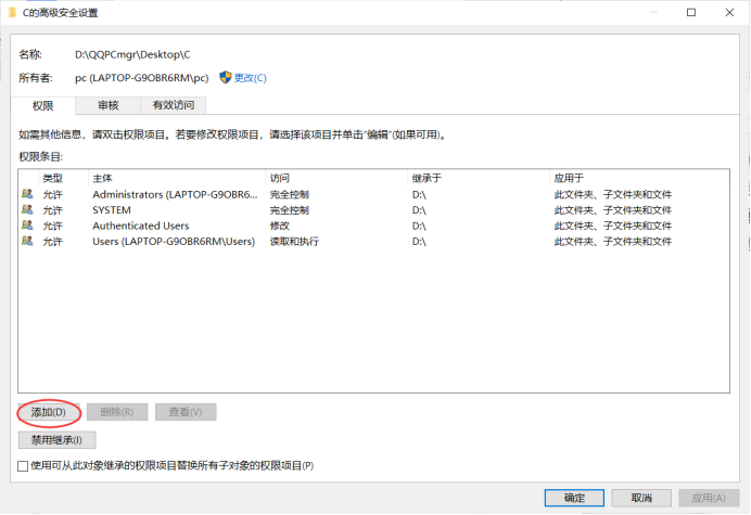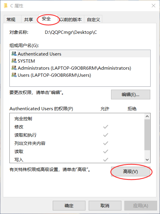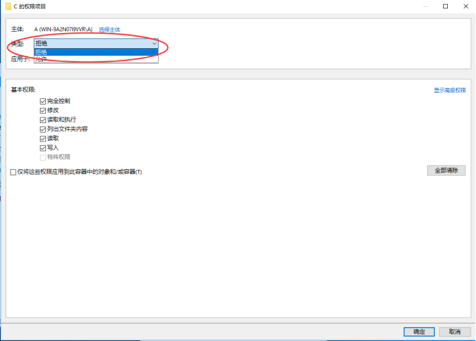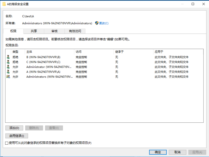 A文件夹设置用户A权限允许完全控制,B,C拒绝完全控制;