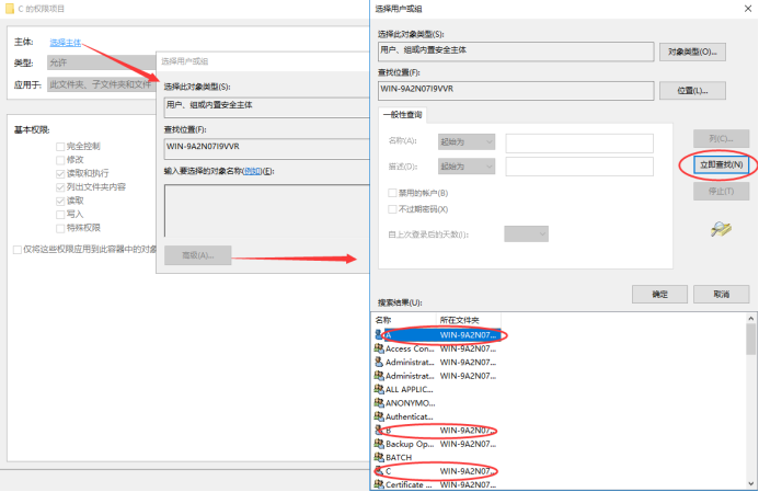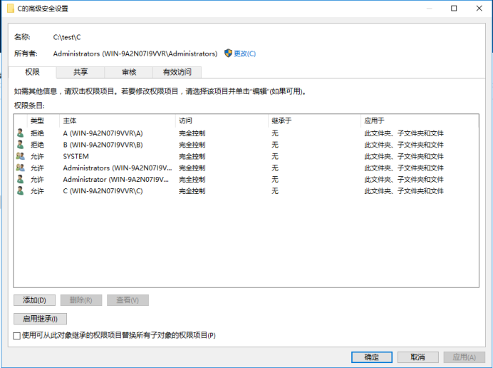 C文件夹设置用户C权限允许完全控制,A,B拒绝完全控制;